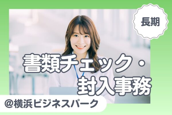 横浜ビジネスパークでの書類のチェック・封入事務/未経験OK/電話対応なし/土日祝休み/服装自由/交通費全額支給